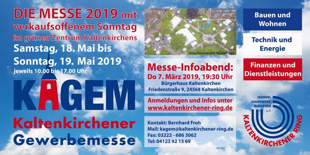 am Donnerstag den 7. März 2019 findet um 19.30 Uhr im Bürgerhaus-Kaltenkirchen (Friedensstr. 9) der 2. Messe-Infoabend mit den neuesten Informationen zur Kaltenkirchener-Gewerbemesse - KAGEM statt. Melden Sie sich gerne zu diesem Infoabend an unter kagem@kaltenkirchener-ring.de oder per Telefon untter 04123 92 15 69.